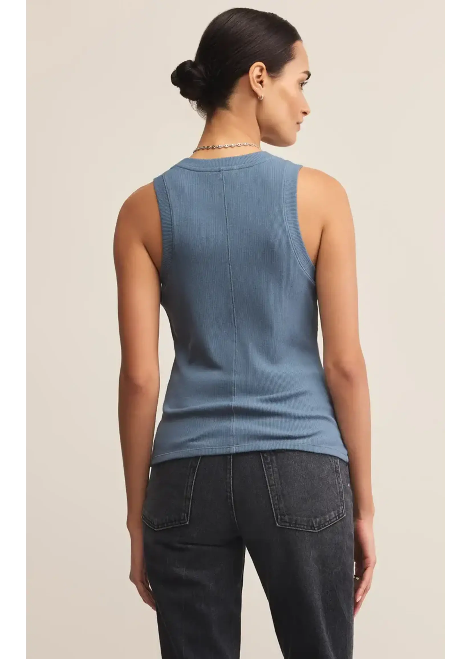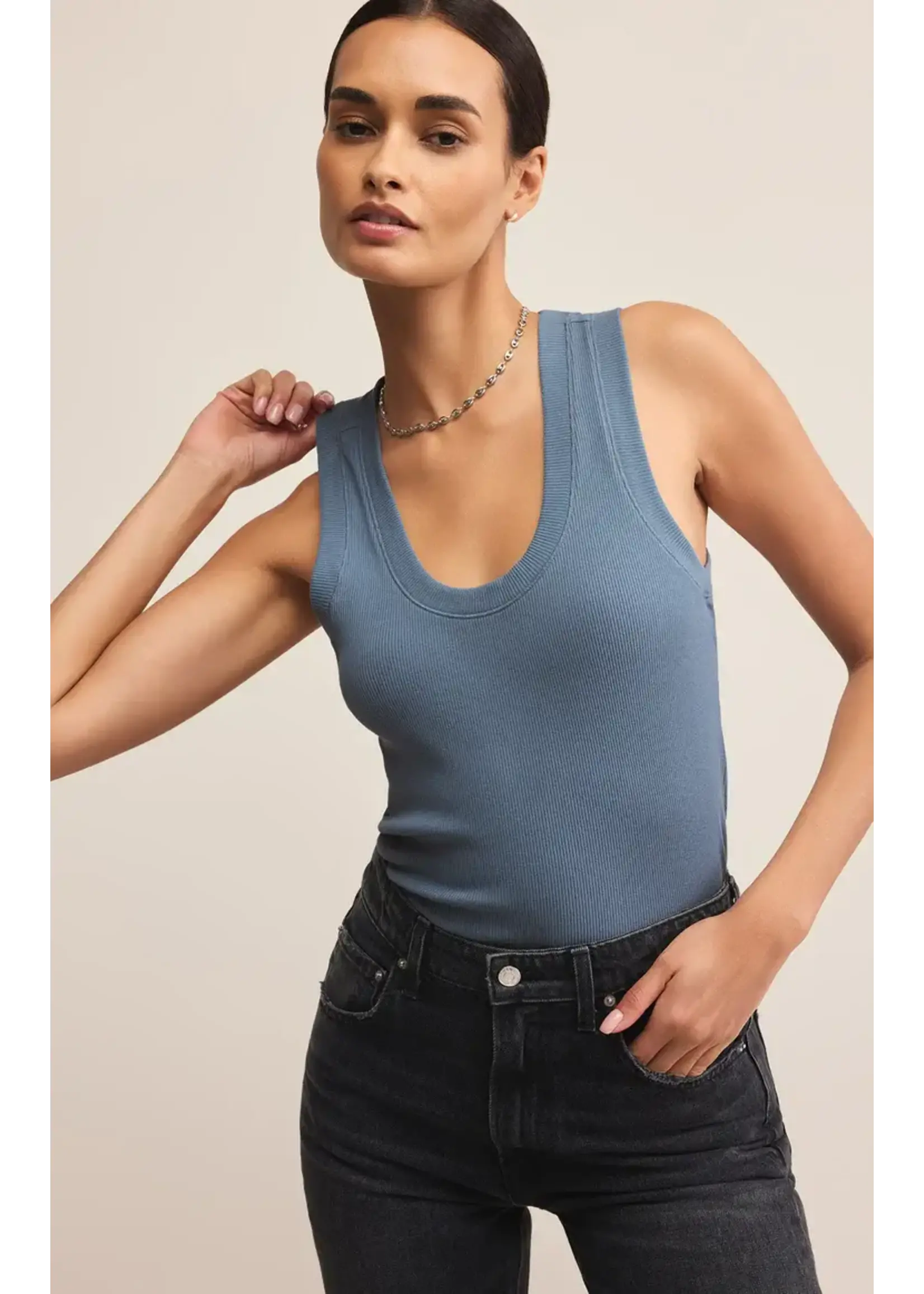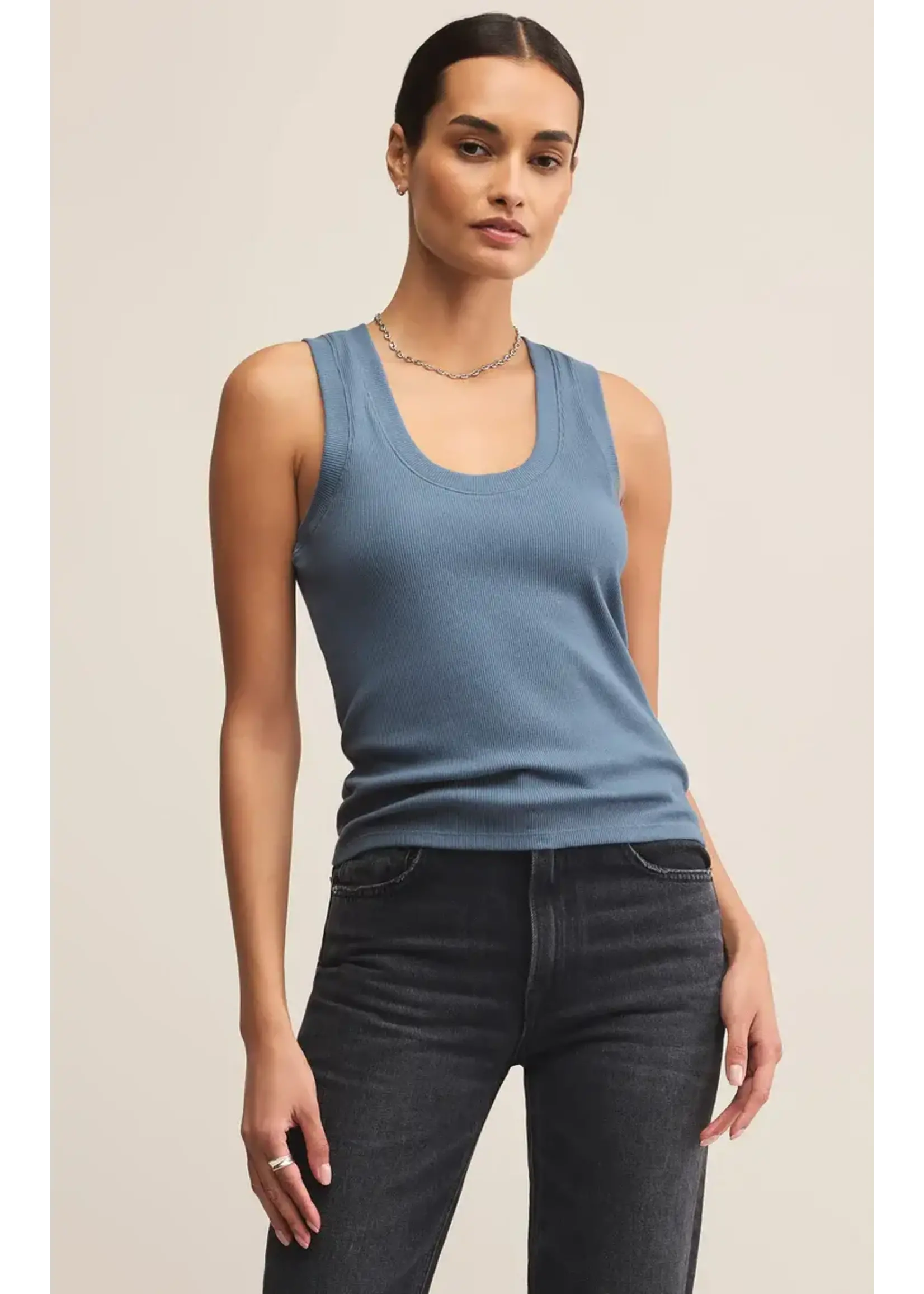 Our Sirena Rib Tank is made in our Premium Feather Rib fabric. We love this fitted tank tucked or untucked